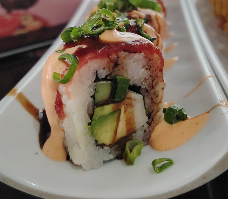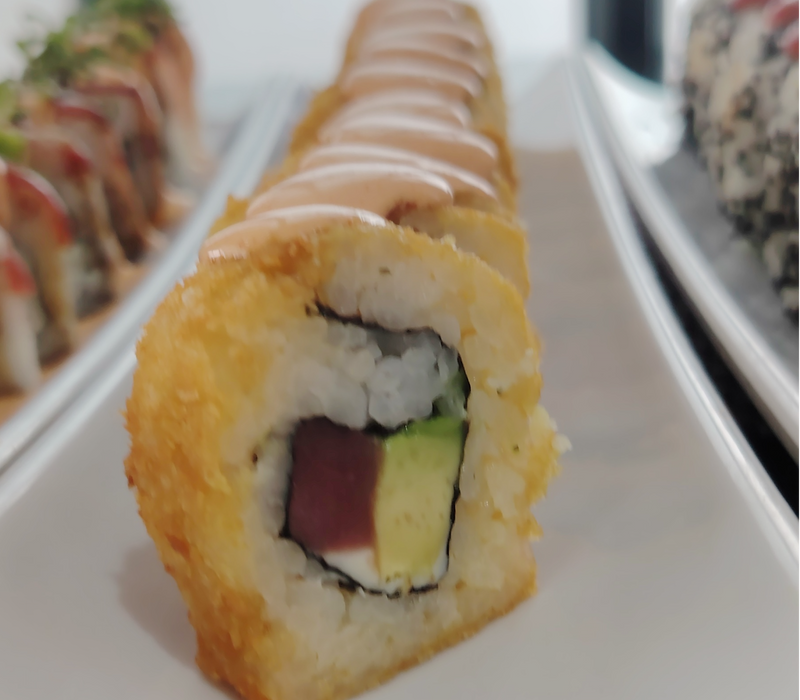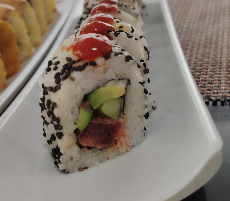 Por dentro: Aguacte, pepino, queso crema y atún spicy