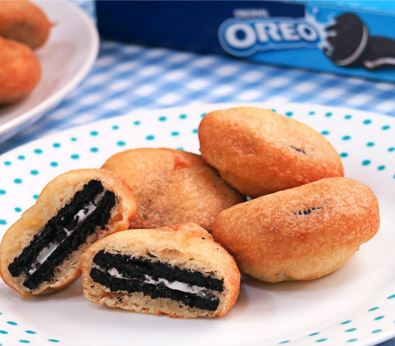 Galletas oreo en tempura especial, servidas con helado de vainilla y chocolate