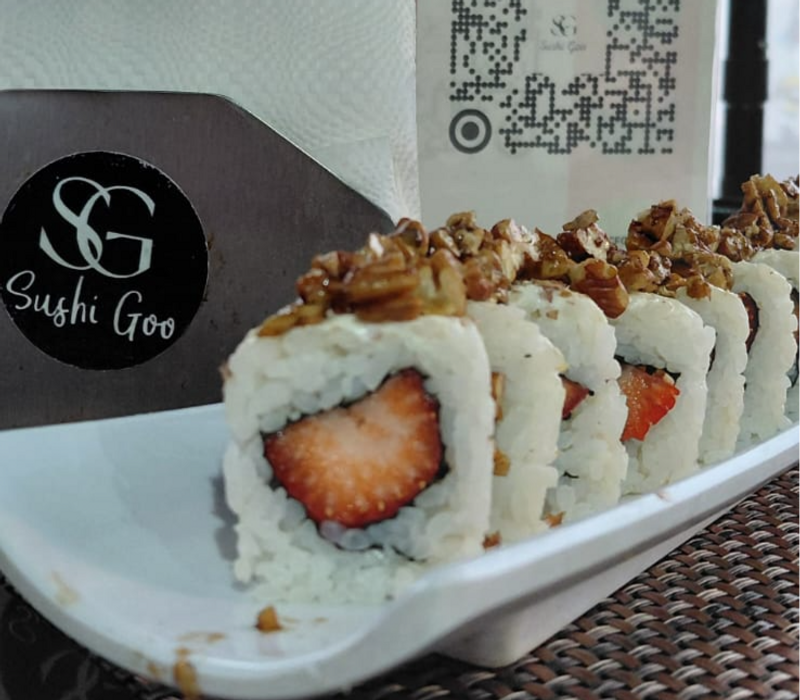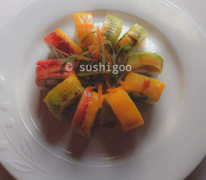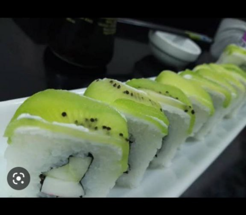 Por dentro: Queso crema, aguacate, pepino, kiwi, mango, fresa y manzana