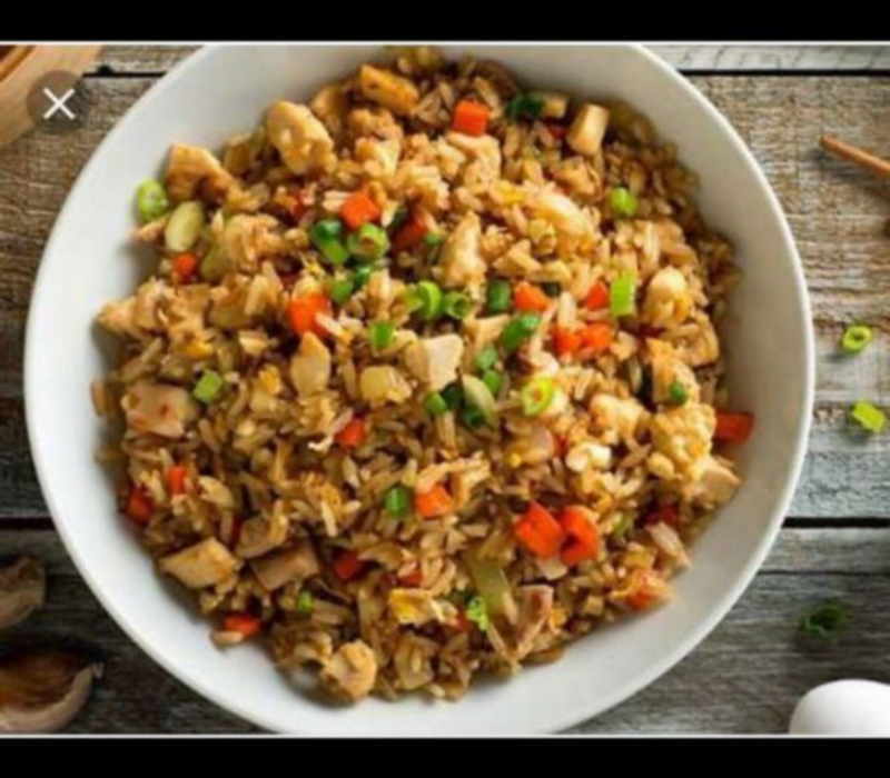 Arroz nacional frito con verduras, huevo y pollo