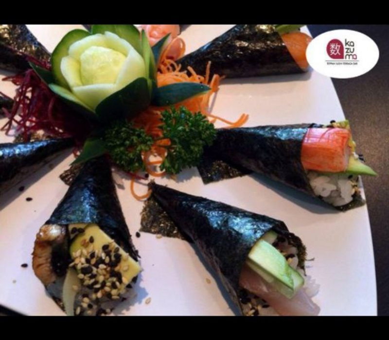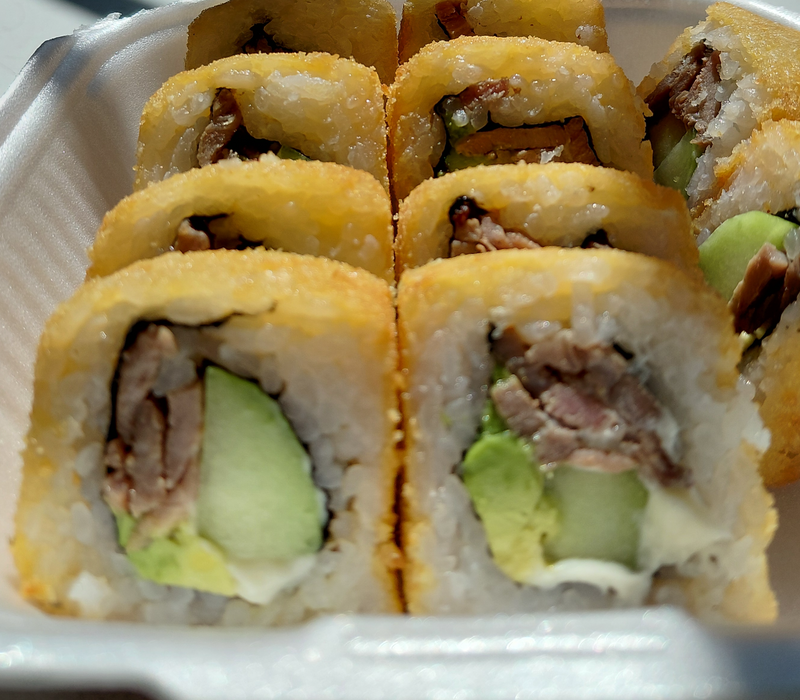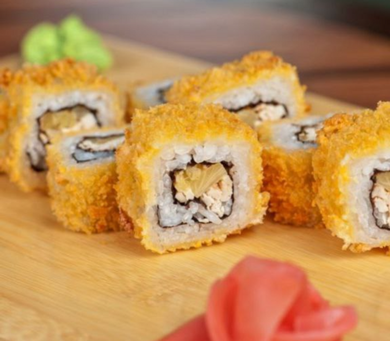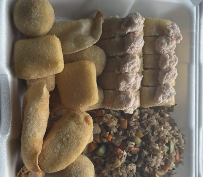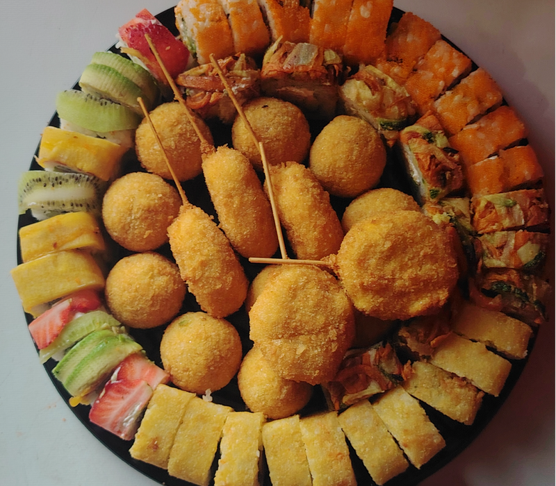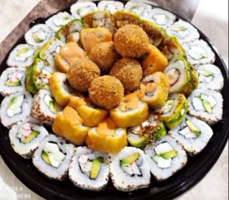 1 platano roll, 1 maki empanizado, 1 phila especial, 1 kani maki y 1 orden de yakimeshi bolita (8pz)
