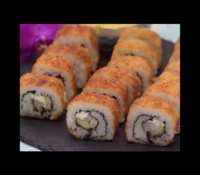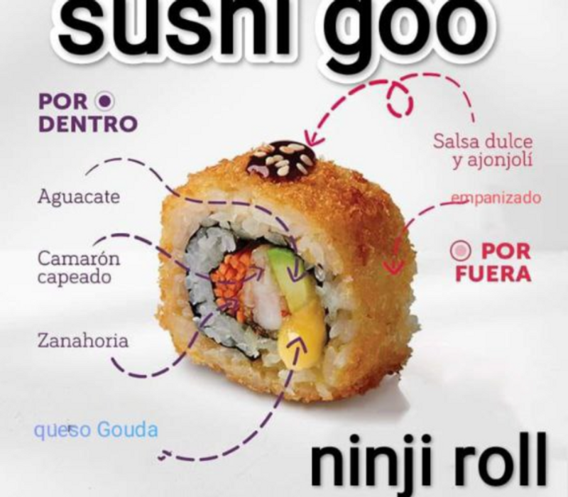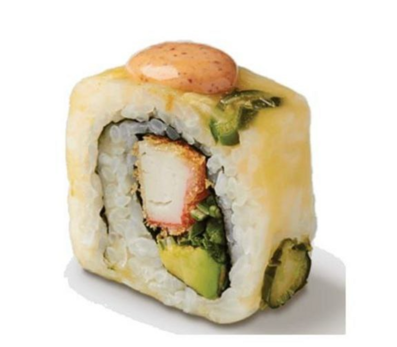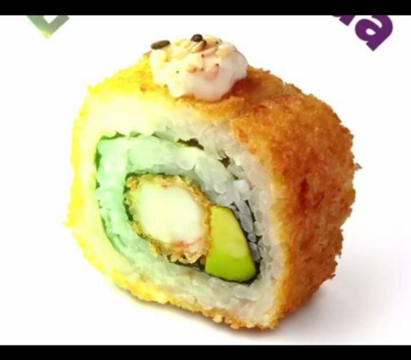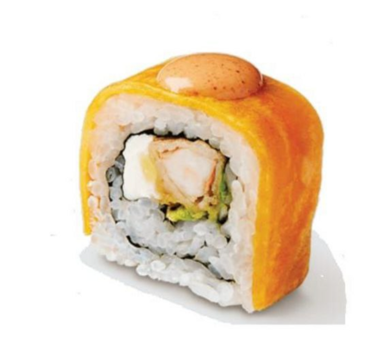 Por dentro: Ajonjolí, lechuga, zanahoria, pepino, aguacate, camarón empanizado, queso gouda gratinado, aderezo chipotle y salsa de anguila