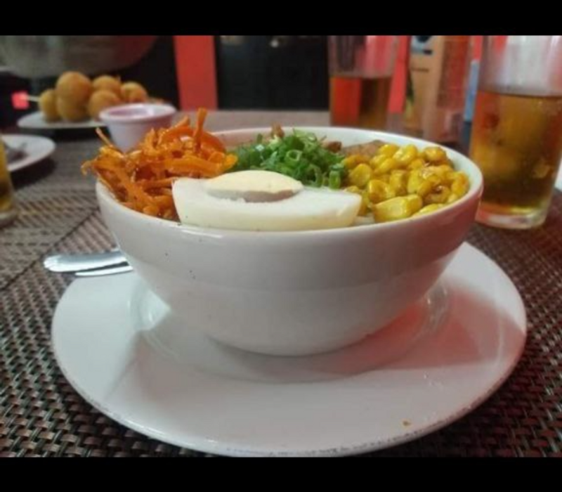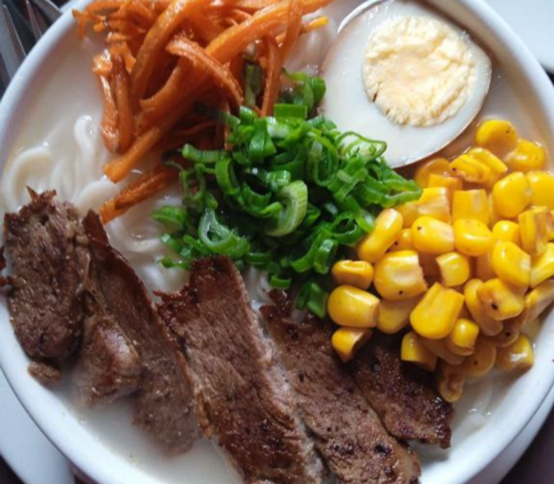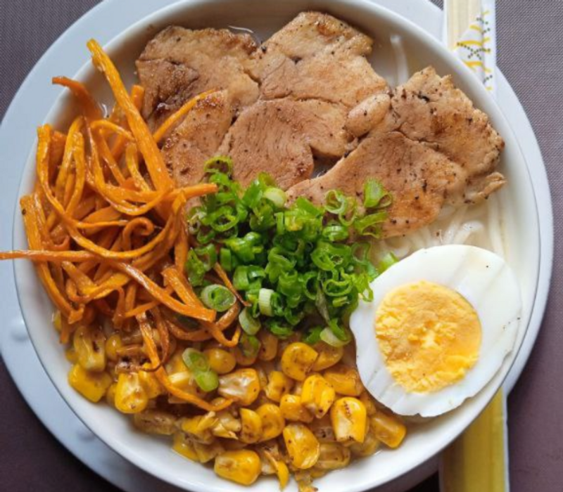 Fondo ramen, topping de elote, zanahoria, cebollin y huevo hervido