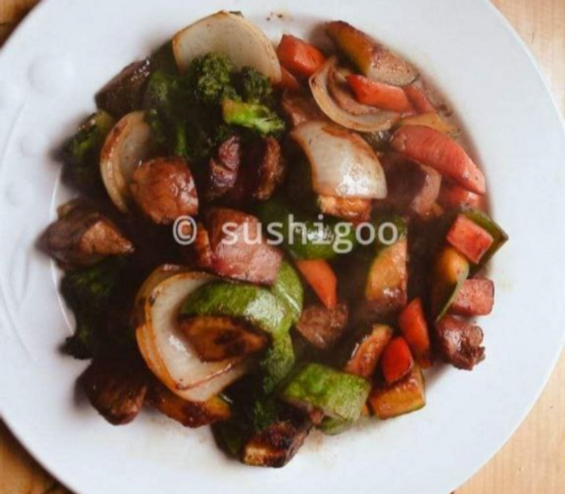 Verduras a la plancha y arrachera sazonado con soya