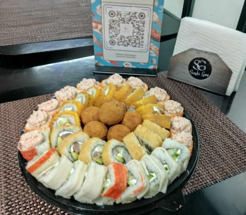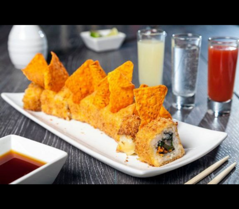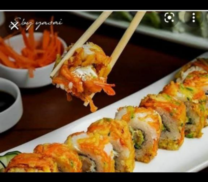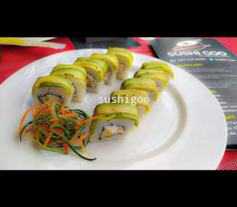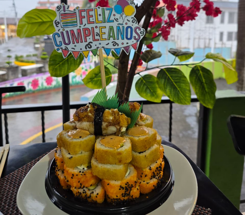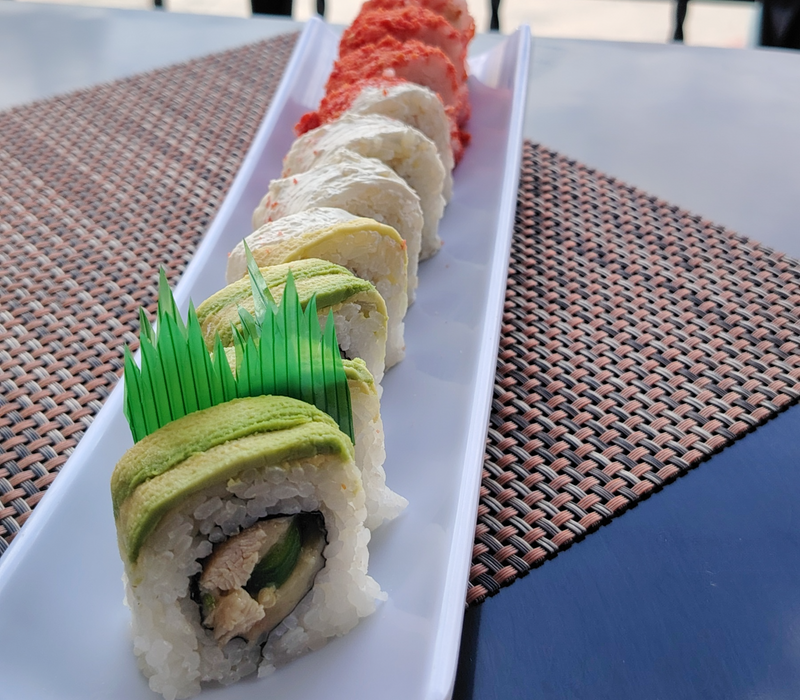 1 chipo roll, 1 yasai roll, 1 california especial, 1 maki tropical roll, 1 orden de yakimeshi bolita (10pz) y 1 orden de kushiages de platano con queso