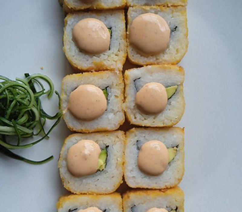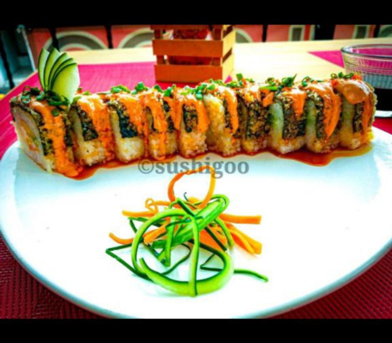 Por fuera: Alga empanizada, aderezo chipotle, aderezo de anguila, masago y cebollin