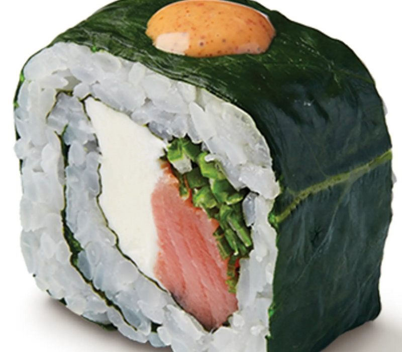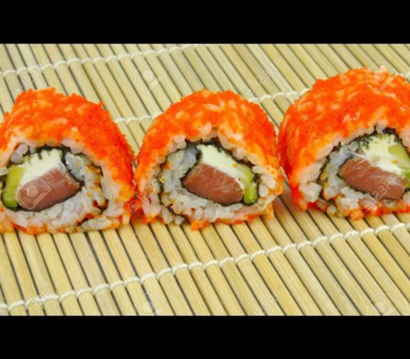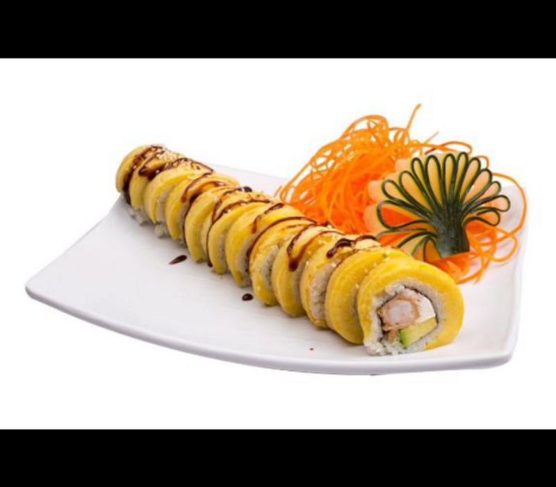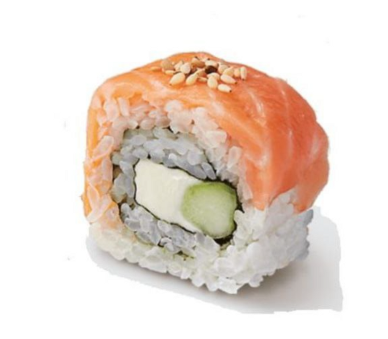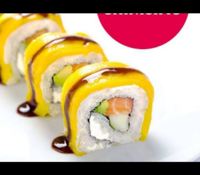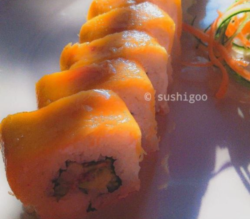 Por dentro: Queso crema, aguacate, salmón, masago y mango