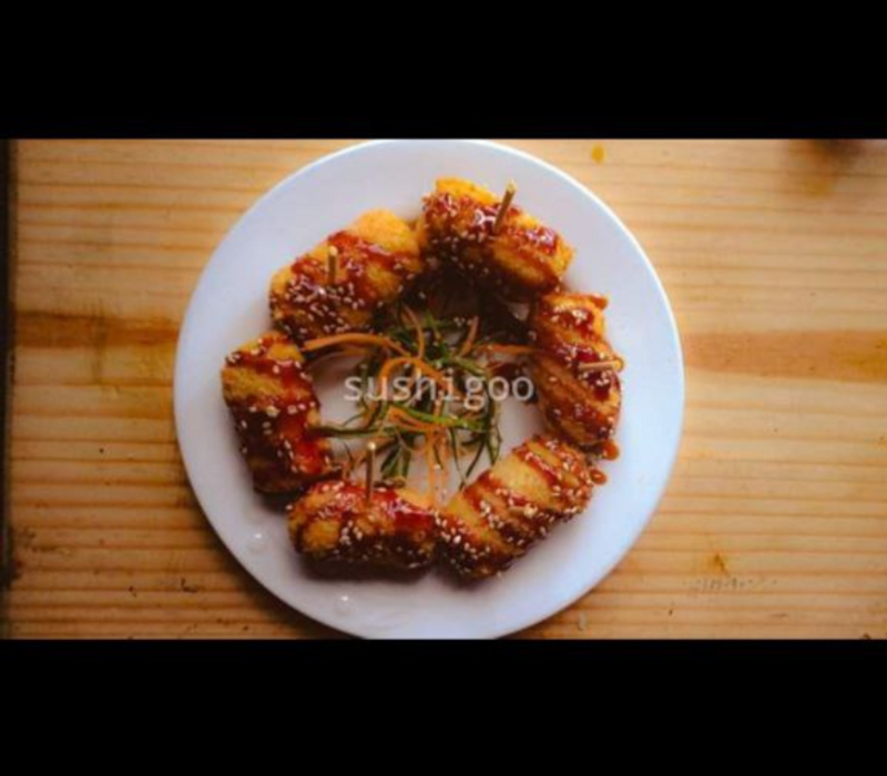Surimis rellenos de queso philadelphia empanizado con salsa de anguila y ajonjolí espolvoreado