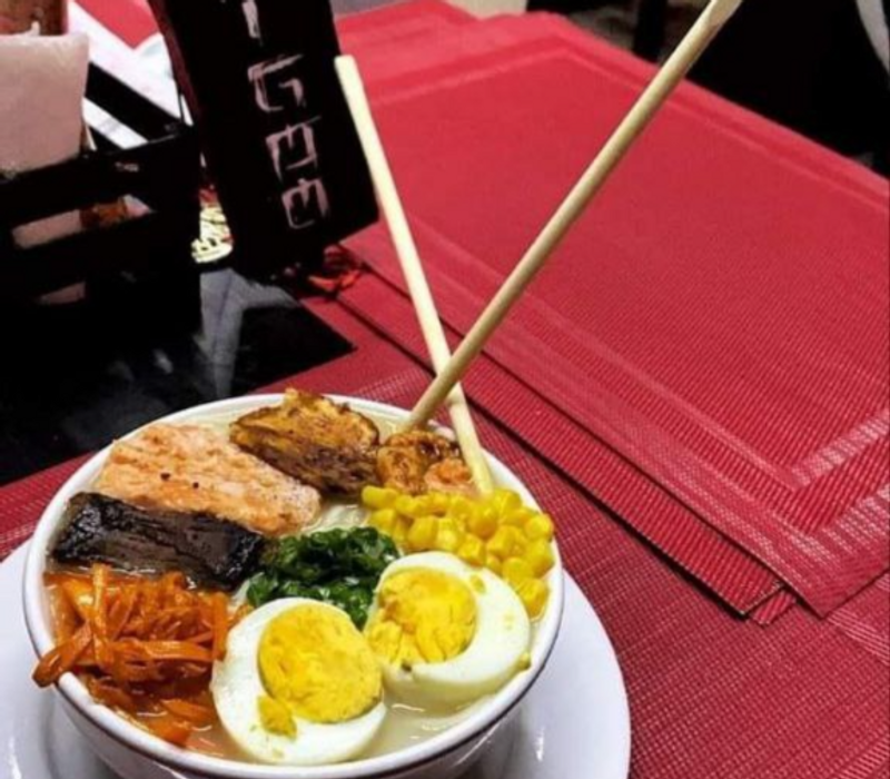 Pasta ramen con fondo especial y topping de zanahoria, cebollin, elote asado, huevo hervido, dos proteinas a elegir (Camarón, arrachera, pollo y salmón)