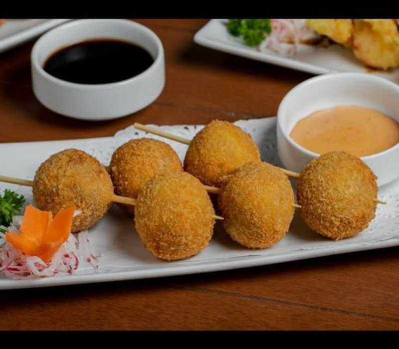 Bolitas crujientes de arroz con pollo, camarón y queso manchego, acompañadas con aderezo chipotle
