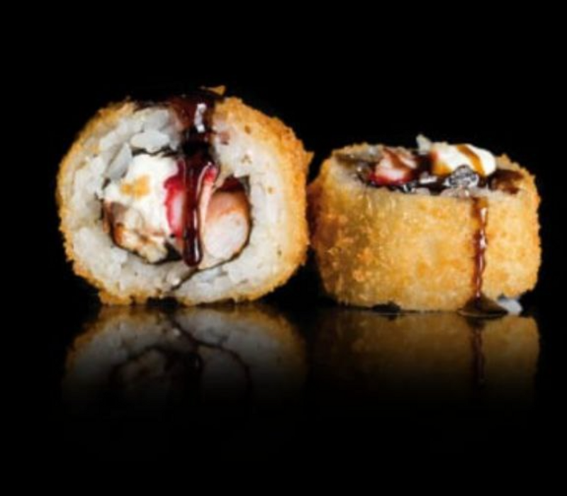 Por fuera: Empanizado, servido con salsa de anguila y ajonjolí espolvoreado