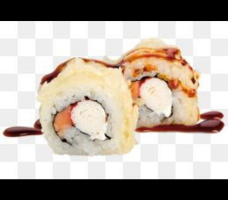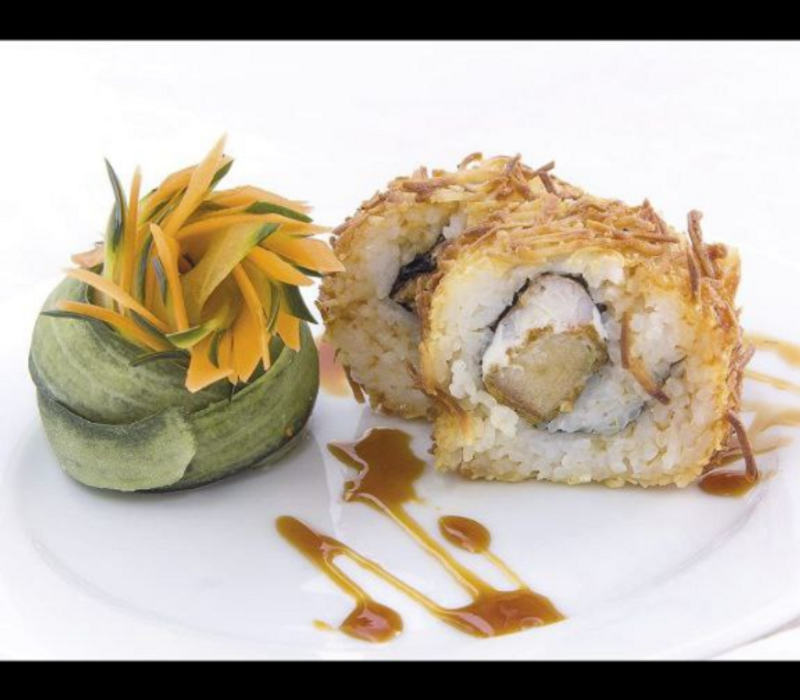 Cono relleno de arroz, pepino, queso crema, aguacate y cangrejo empanizado bañado con salsa de anguila