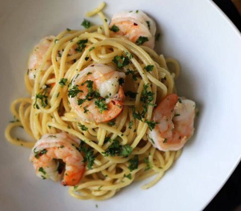 Pasta servida con camarón , zanahoria, brócoli y cebollin salteados con aderezo cremoso de chipotle