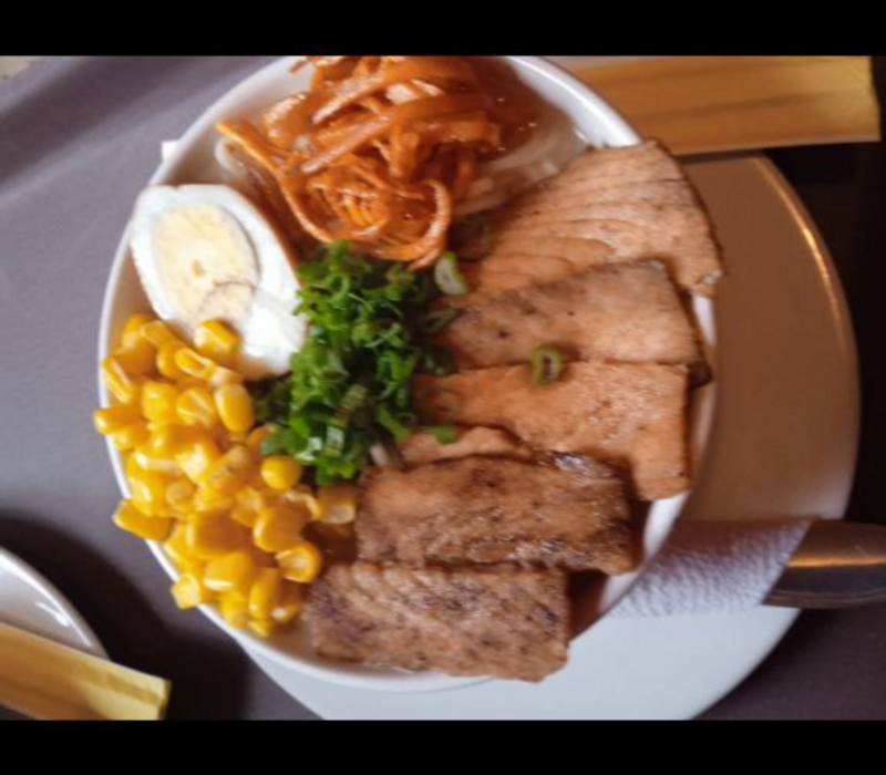 Pasta ramen con fondo de sopa especial, topping de cebollin, salmón, zanahoria crocante, grano de elote y huevo
