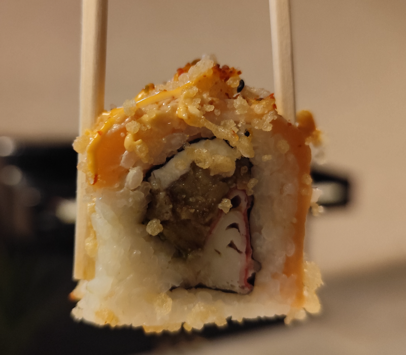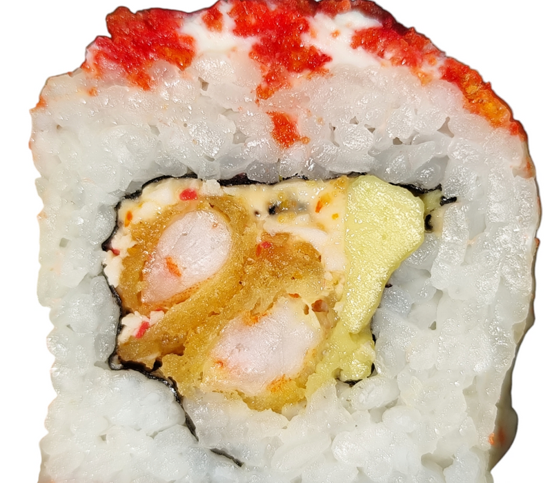 Por fuera: Tampico, camarón empanizado, gotas de chipotle, cubiertos de masago.