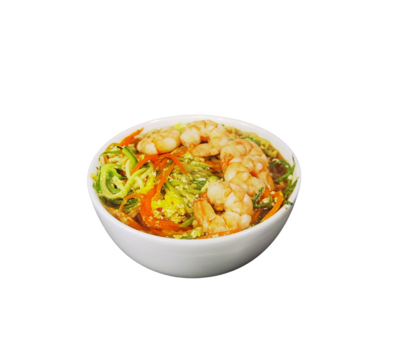 Caldo sabroso con un toque marino, fideos al dente, camarones y salmón fresco, acompañado de kamaboko, cebolleta, huevo cocido y alga nori.