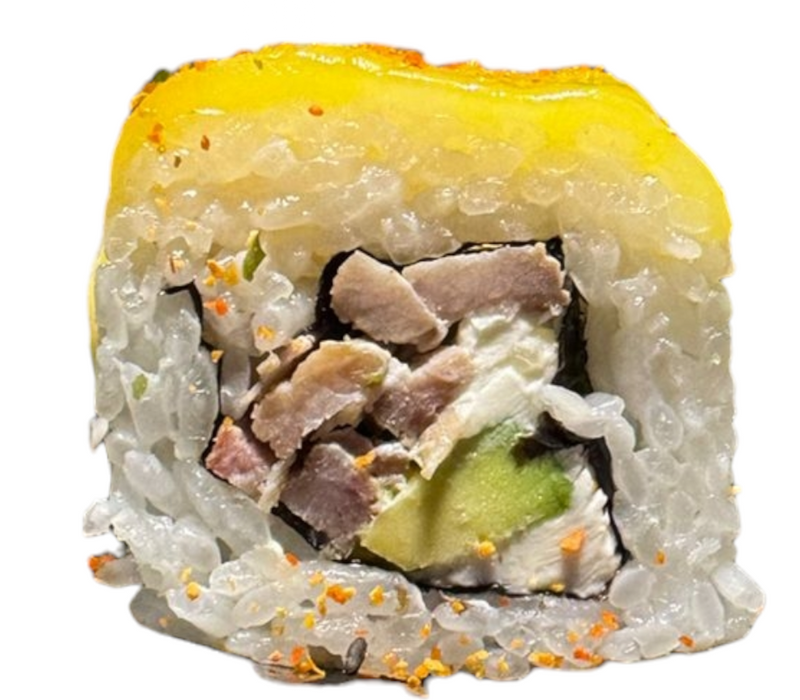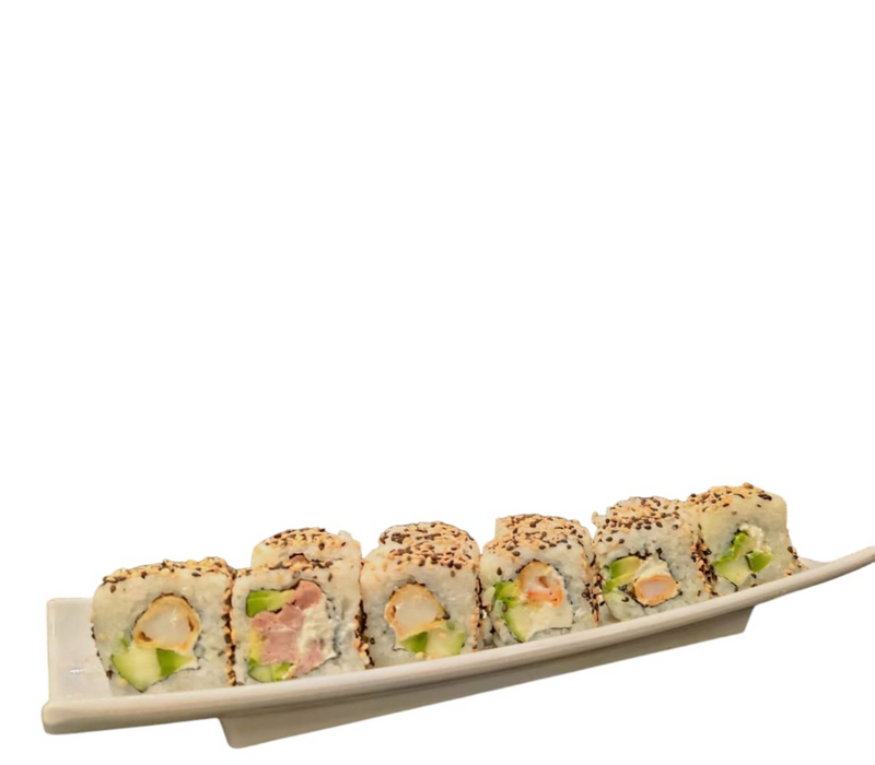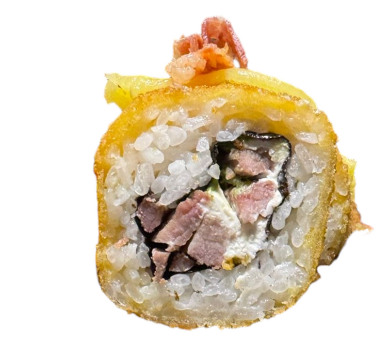 Por dentro: arrachera, camarón empanizado, pepino, filadelfia y aguacate