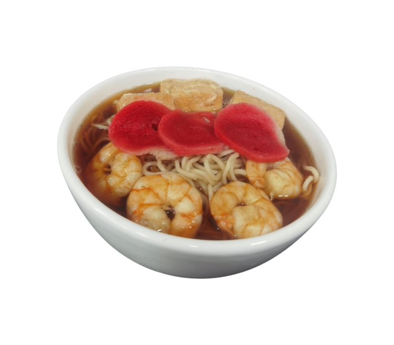 Caldo transparente y sabroso de camarón, fideos al dente, camarones jugosos y frescos, cebolleta, huevo cocido y alga nori.