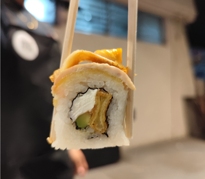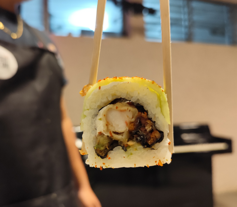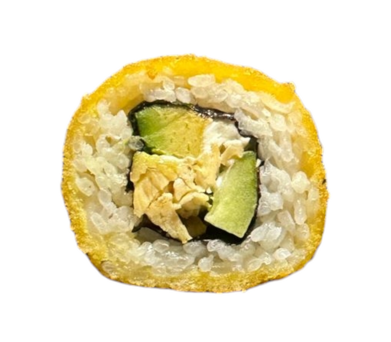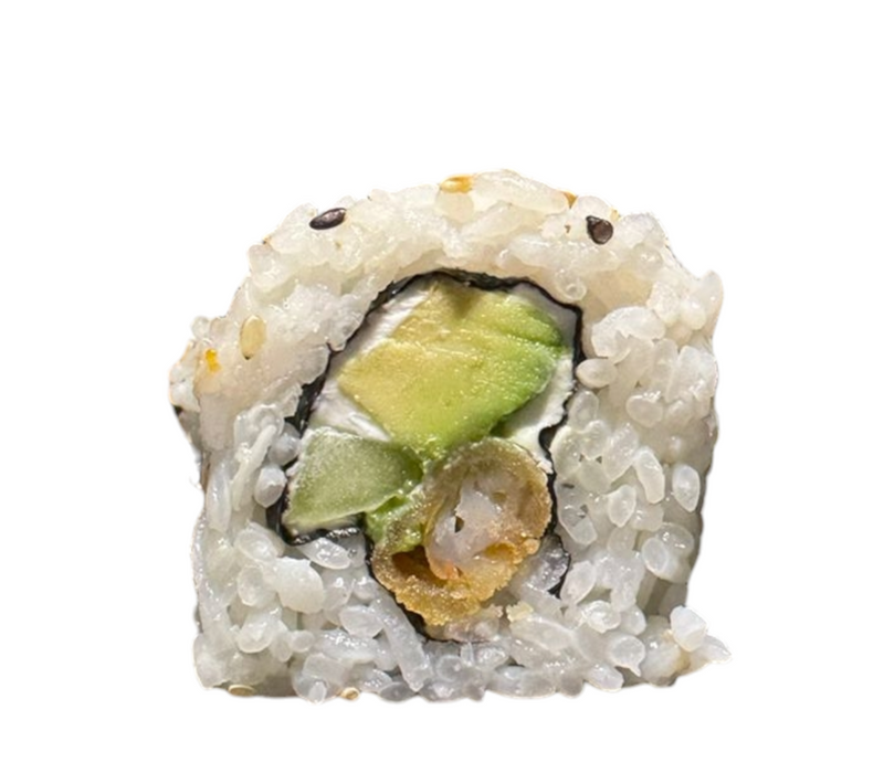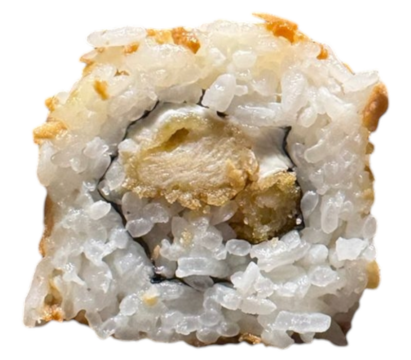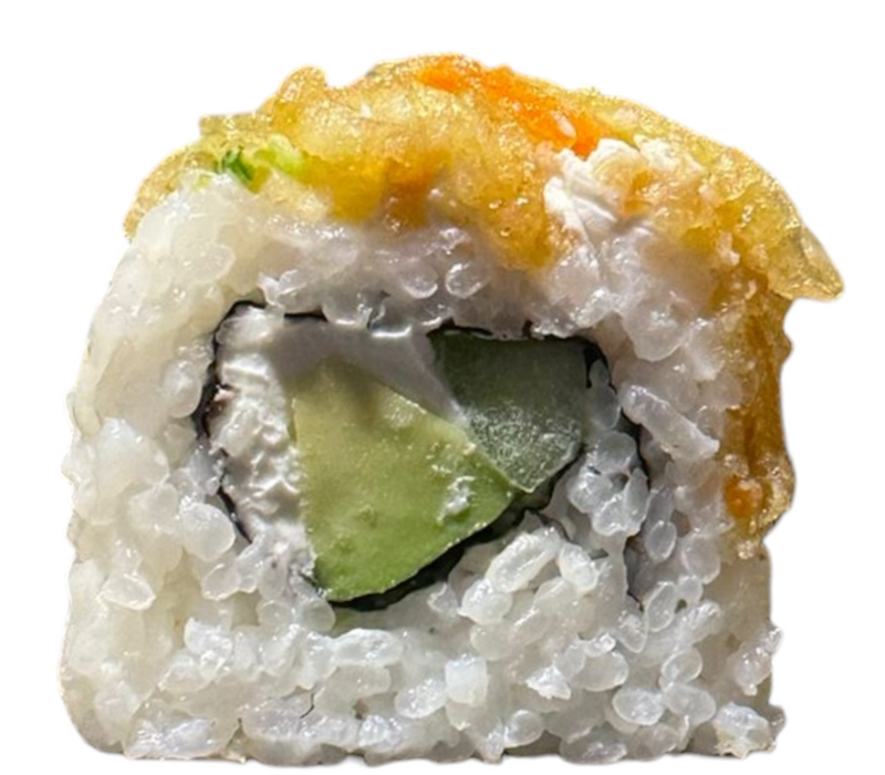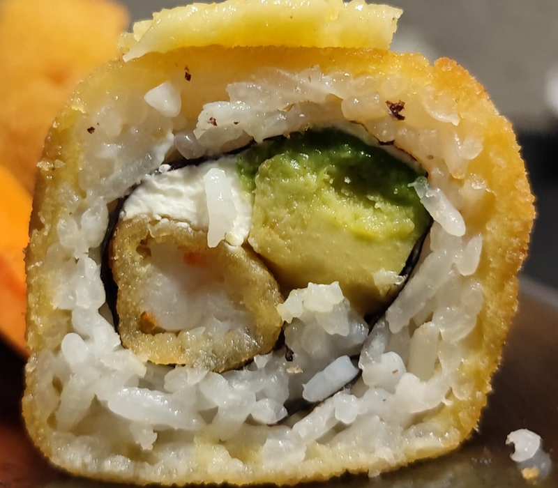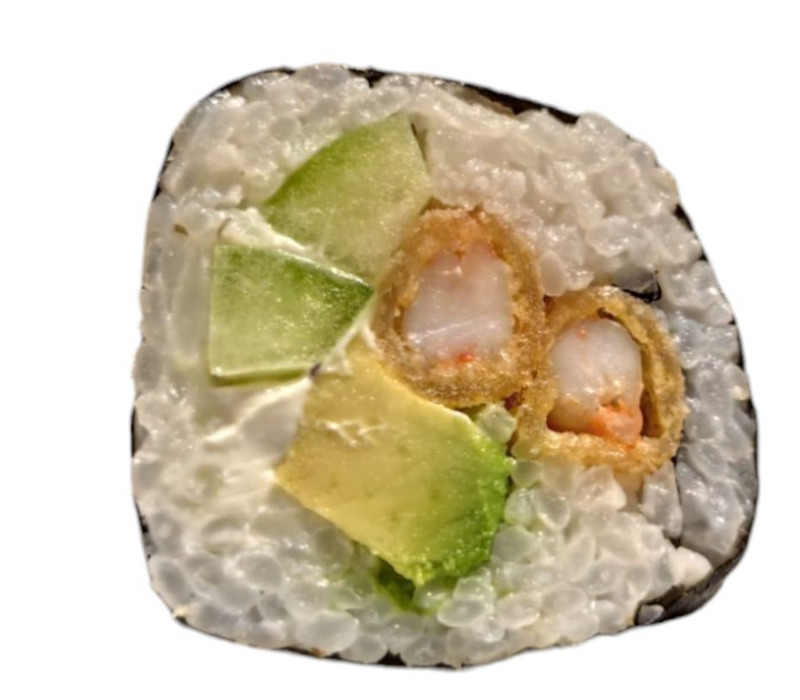 Por dentro: Camarón empanizado, filadelfia, aguacate y pepino.