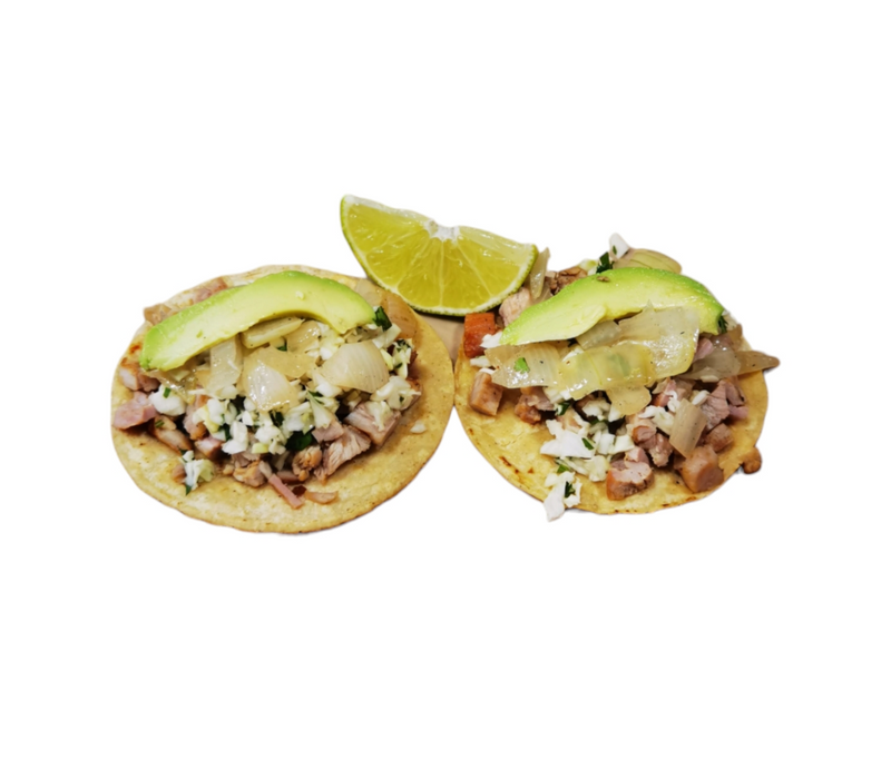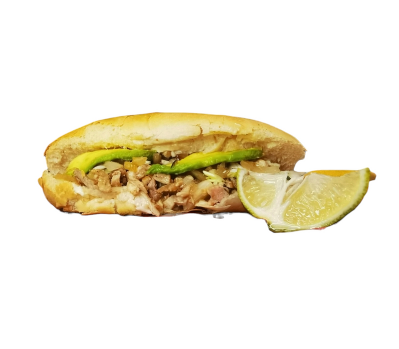 Torta con jugosa carne de cerdo asada a la plancha, acompañada de crujiente repollo, aguacate cremoso y cebolla.