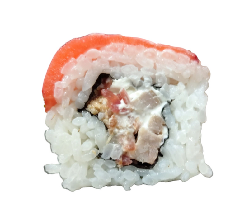 Por dentro: pollo, aguacate, pepino, filadelfia.