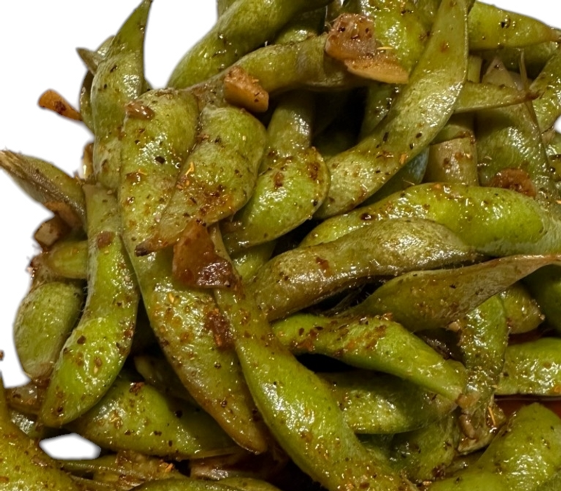 Tiernos ejotes de soya al vapor, cubiertas con un toque de tajín para un equilibrio perfecto entre frescura y un toque picante.