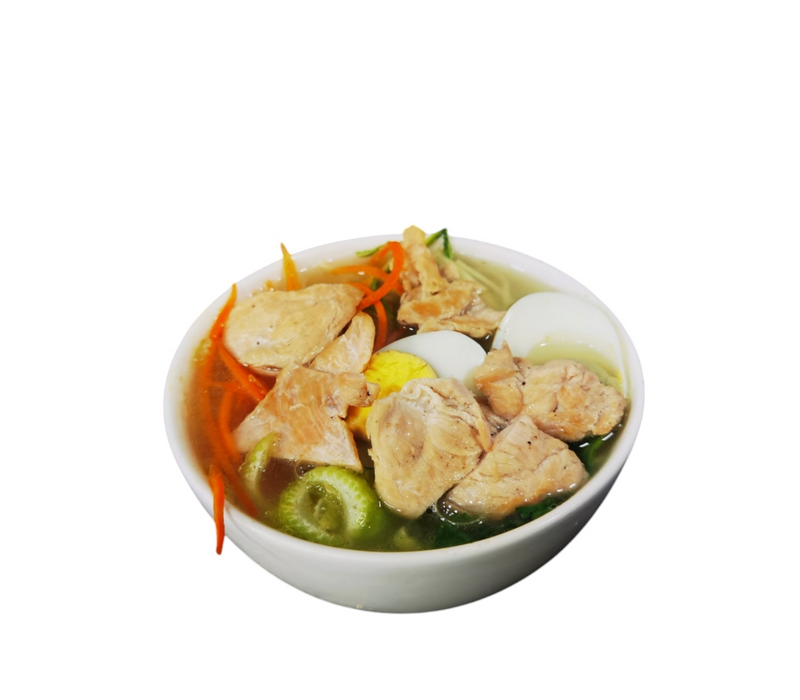Caldo suave y aromático de pollo, servido con fideos al dente, trozos de pechuga de pollo jugosa, cebollin fresca, huevo cocido, y alga nori.