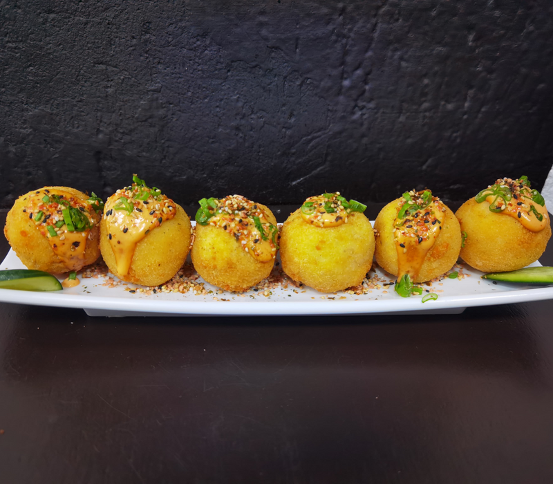 Bolitas de masa dorada, rellenas con el sabor de tu elección: pollo, camarón, arrachera o surimi. Mayonesa, hojuelas de pescado y alga nori.