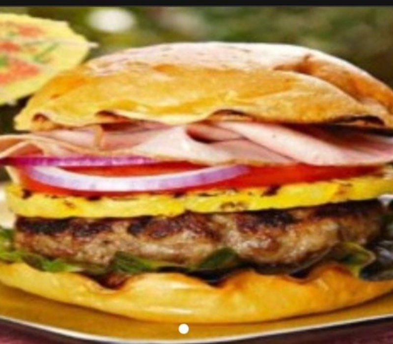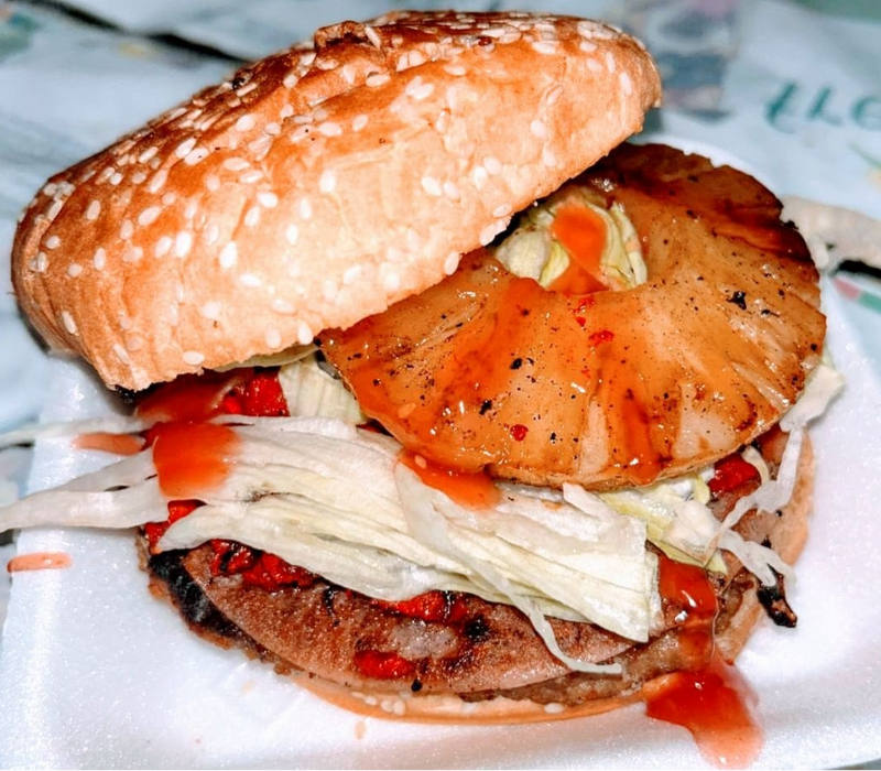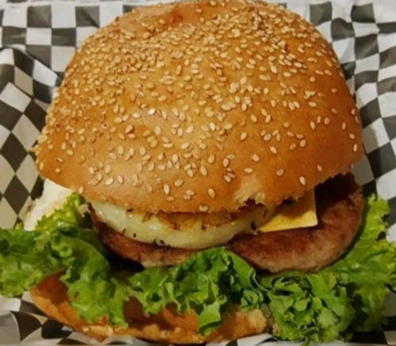 Hamburguesa asada al carbon con piña y queso jamos y mayonesa