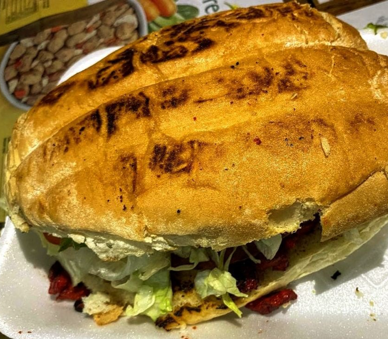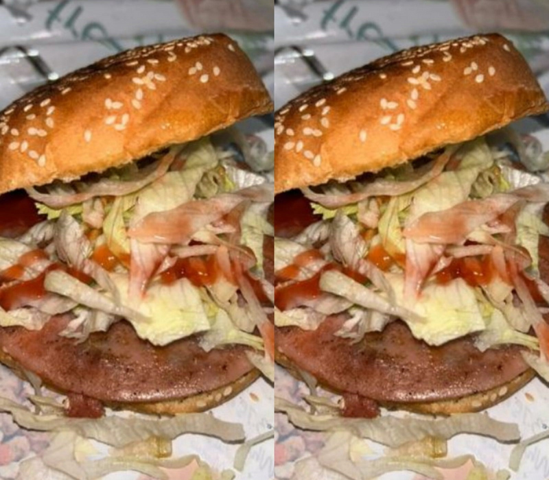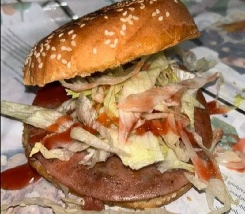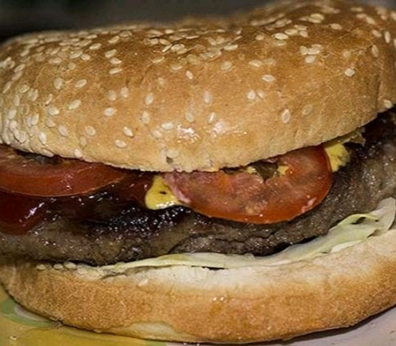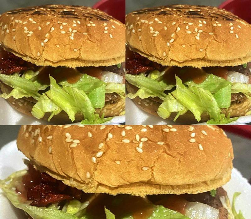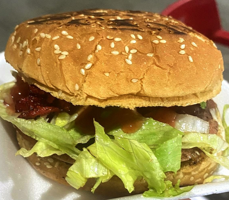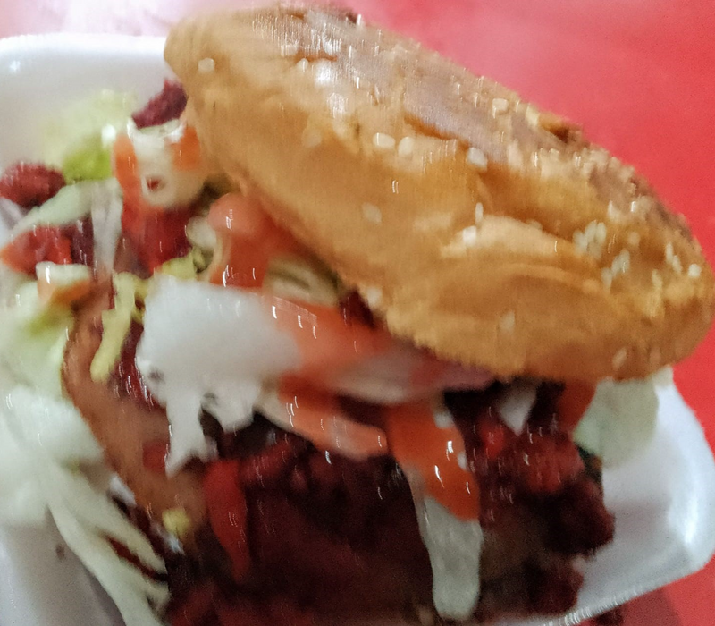 Hamburguesa asada al carbon con carne de trompo, queso jamos y mayonesa