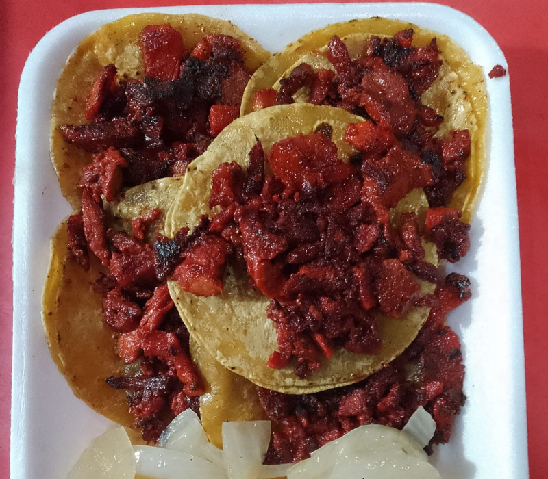 Tres campechanas de trompo y bistec con queso en tortilla de harina chica