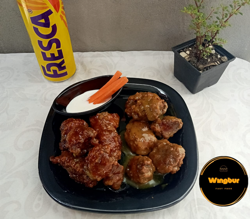 10 pzas de nuestras tradicionales alitas de pollo, 250 grs de papas y 1 bebida a elegir. Incluye aderezo Ranch y bastones de zanahoria.