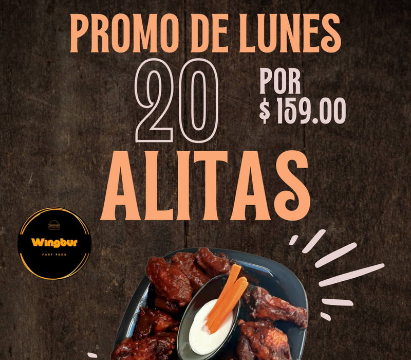 20 pzas de nuestras tradicionales alitas de pollo, bañadas en la salsa de tu elección. Incluye aderezo Ranch y bastones de zanahoria.