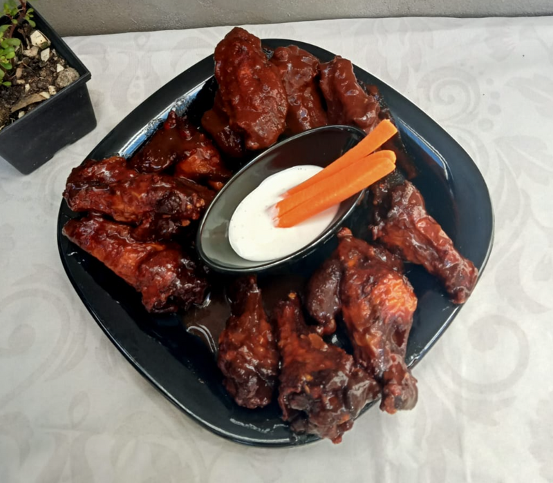 Nuestras tradicionales alitas de pollo bañadas en cualquiera de nuestras 16 salsas a elegir. Incluye aderezo Ranch y bastones de zanahoria.